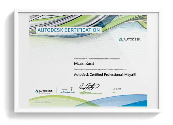 Tale percorso didattico è finalizzato al conseguimento della certificazione AUTODESK MAYA PROFESSIONAL, che sarà garanzia della tua professionalità. L'Istituto Volta, in qualità di Autodesk Training Center, provvederà a far sostenere l'esame di Certificazione presso i propri centri autorizzati.